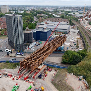 HS2 has moved a 112m long, 1,631 tonne steel bridge into place over Lawley Middleway in Birmingham after constructing the whole structure on a separate, nearby site.