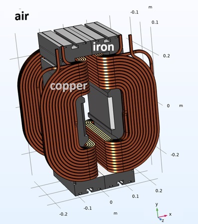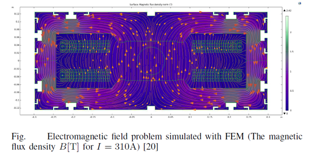 Boundary conditions included magnetic insulation on outer surfaces and symmetry constraints (Dirichlet on one axis, Neumann on another). Nonlinear material properties were incorporated via the B-H curve, and current densities were defined subdomain-wise (e.g., helical approximations in coils).