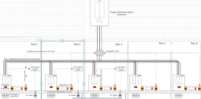 main incoming supply split to 5 separate bays each with their own TP DB for various circuits, each having their own E stop