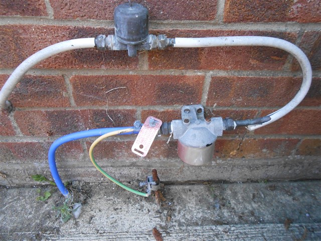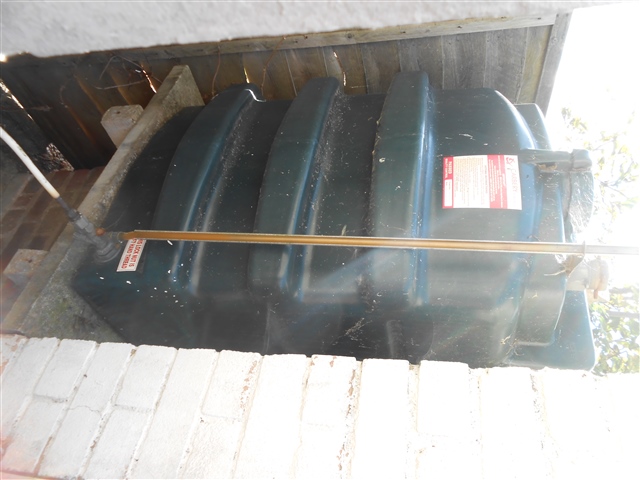 There's a thing. The tank is plastic and raised off the ground. The oil pipe is covered in plastic so normally is not an extraneous-conductive-part. But the earth rod makes it an extraneous-conductive-part thus it needs bonding. So now the P.M.E. earth is exported to the outside pipe. Is that good? A lost neutral may raise the metal pipe up to mains Voltage and anyone touching it at the oil filter position may receive a shock. A sideways picture of the oil tank..........