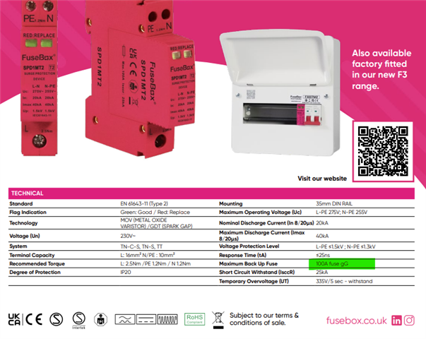 As per the datasheet below it looks like the SPD relies on upstream fuse protection (<=100A gG required).