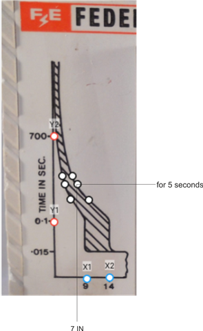 To be sure of a trip, you need a PSSC to the right of the shaded zone, at horizontal 5 sec mark. Given the highly non-linear y axis, I'd be very wary of using the image on the breaker itself there are nearly 3 orders of magnitude between 100ms and 700 seconds, if you really need to know, you need the makers data. Which could be awkward, as they have not been made for some time.