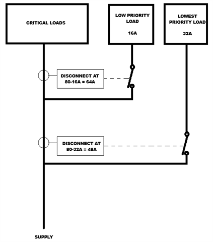 • Manual reset probably isn't ideal from a consumer's point of view (flat EV in the morning because one of the teenagers had a late night shower and neglected to press a button afterwards?). Interestingly that Schneider unit seems to take a not dissimilar approach - but resets automatically after 5 or 10 mins (so if the overload remains it will keep reconnecting, overloading, then disconnecting ... which doesn't seem ideal). If you want to avoid a "smart" system (that can dynamically adjust according to the actual loads) I would have thought it would be simpler to measure the side you're *not* disconnecting - with a margin to allow for the disconnectable load. So say you had a 20A low priority load and a 80A supply, you'd disconnect when the priority loads exceeded 60A (i.e. the 20A margin no longer remains) and reconnect once it had dropped below (with a time delay if you wish). You could cascade such an arrangement for several low priority loads if you wished. E.g.