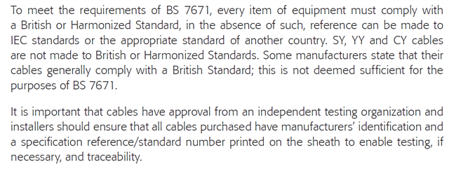 BUT ... pedantically, the same perhaps goes for ANY cable that you can't read the marking on the sheath, for example. How can you tell, when all you can see is the insulated cores and a bit of sheath at accessories. Does the cable actually conform, and/or did it when it was installed?