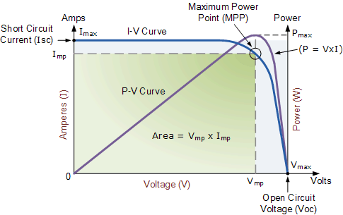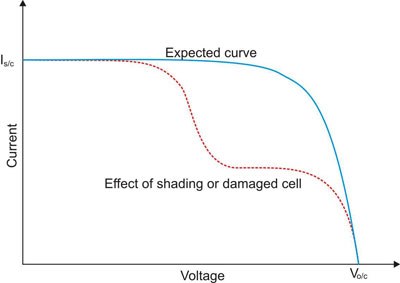 An example of a stepped IV curve when one of the 2 trings is a panel short - here an operating point near the lower knee has the larger total area (power) unless the lower knee is a lot less than half the current, but ideally something closer to the blue curve is desired.