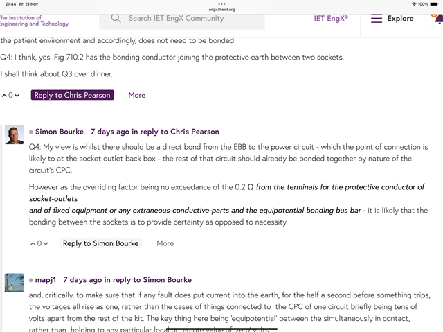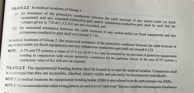 0.7Ω maximum resistance within the room between the terminals of the protective equipment conductor of socket outlets and fixed equipment and the EBB, and between any extraneous conductive part and the EBB.