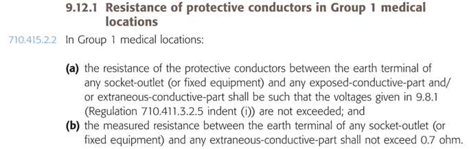 the measured resistance between the earth terminal of any socket-outlet (or fixed equipment) and any extraneous-conductive-part shall not exceed 0.7 ohm.