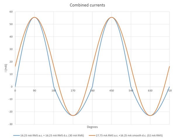 Here we have slightly more at 16.25 mA a.c. + 16.25 mA d.c. because the combined RMS is 30 mA. So, I thought let's get as close as possible with pure a.c. Problem is that the average current > 0, so it is necessary to add a little smooth d.c.