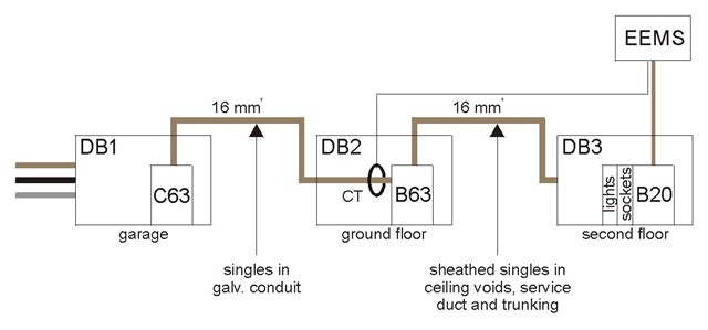 I would like to get the installation as ready as it can be for when I get a system put in. On the second floor, there is a small DB which serves one lighting and one socket circuit. For some reason which is unclear, the distribution circuit uses 16 mm² cable. So the easiest and most economical approach would be to wire the inverter output into the second floor DB as shown in the diagram below.