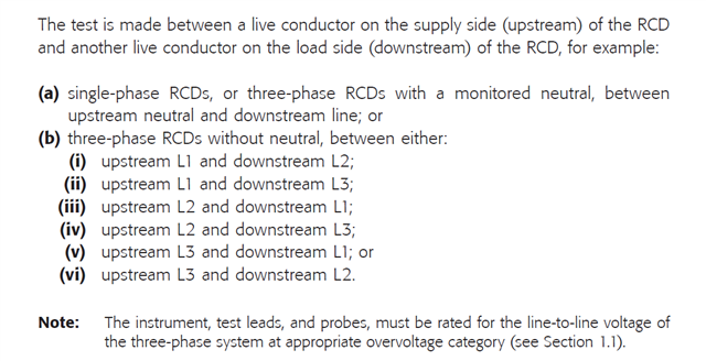 I'm not so sure this is correct for all testers ... because the test method is also valid (if the test equipment is so designed) for testing three-phase RCDs in systems with no neutral, where only a downstream and upstream line conductor are available. Guidance Note 3 says the following: