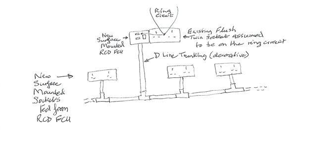 I would like to understand if such an arrangement would be feasible before I call in a qualified electrician to quote for it. The reason for asking is that it would allow the provision of surface mounted sockets thus avoiding the need for disruptive cable chases in the wall.