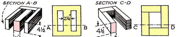 Areas shaded pink are the limiting core areas in these designs. Ignore the ancient 'inch' notation. Unless you want to memorize  8 turns per volt per 1 inch square core area for 50Hz  transformer steels instead....