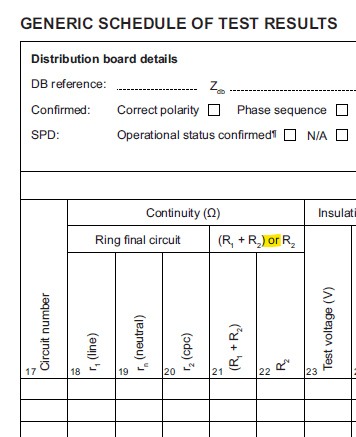 You are checking for CPC continuity, i.e. R2 is let's say, around 0.5 Ω (obviously, depending upon the length of the circuit). You can do this one of two ways. First, by connecting your meter to both ends of the CPC using a 'wander lead', you measure R2 directly. The second method is easier: join line and CPC in the DB and measure between them at the far point. This gives you R1 + R2. You put one or the other on your generic schedule.