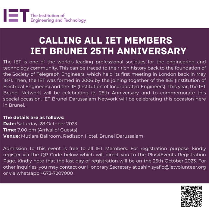 Address: The Institution of Engineering and Technology, Brunei Darussalam Network, Second Floor Apartment, Unit 15, Wisma Global 2000 Bangunan Awg Ahmad bin Awg Hassan & Anak-Anak Kg Kiulap, Bandar Seri Begawan, BE31518 Brunei Darussalam