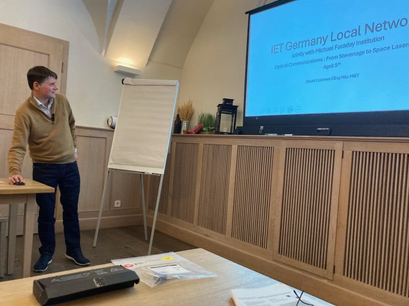 The evening’s main feature was a presentation by David Coleman CEng MSc MIET, Technical Leader at Cisco Systems GmbH, titled “Optical Communications: From Stevenage to Space Lasers.” David began with an overview of optical communication fundamentals, contrasting light-based transmission with microwave systems and outlining the core components: semiconductor laser diodes, optical fibres, and receivers. He discussed the refinement of diode technology, fibre design variations, and challenges such as attenuation and non-linear effects at high power.
