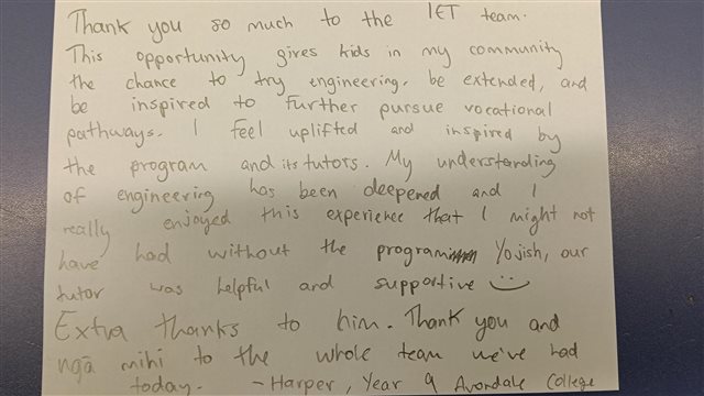 Eleanor Batley, the Teacher of Technology at Avondale College, commented: “Thank you so much to Shankar for leading the session. He is a natural teacher, and the day was beautifully coordinated and efficiently set up. It continues to be a pleasure to have these IET sessions. Many students have benefited from them over the years, since Frank first brought this project to my old school, Takapuna Normal Intermediate. I appreciate the time, effort, and cost to individuals and their employers that goes into making it happen. The [free] opportunity that you are providing to our students at these events, particularly those who might not be able to attend otherwise, is so valuable. The many kind individuals who tutored the kids over the years have undoubtedly sparked an interest in pursuing a career in engineering that might otherwise have been overlooked.”