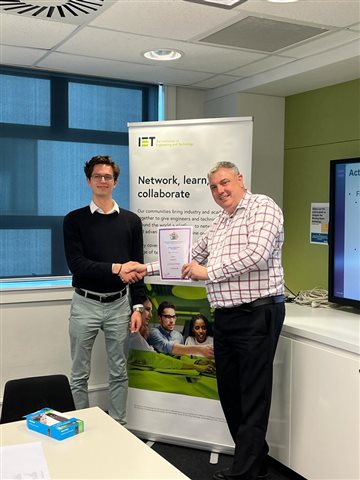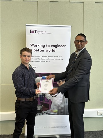 The award certificate, together with $500, was presented to Adam by IET New Zealand Wellington & South Island Committee Member and Deputy Chairperson Amal Punchihewa.